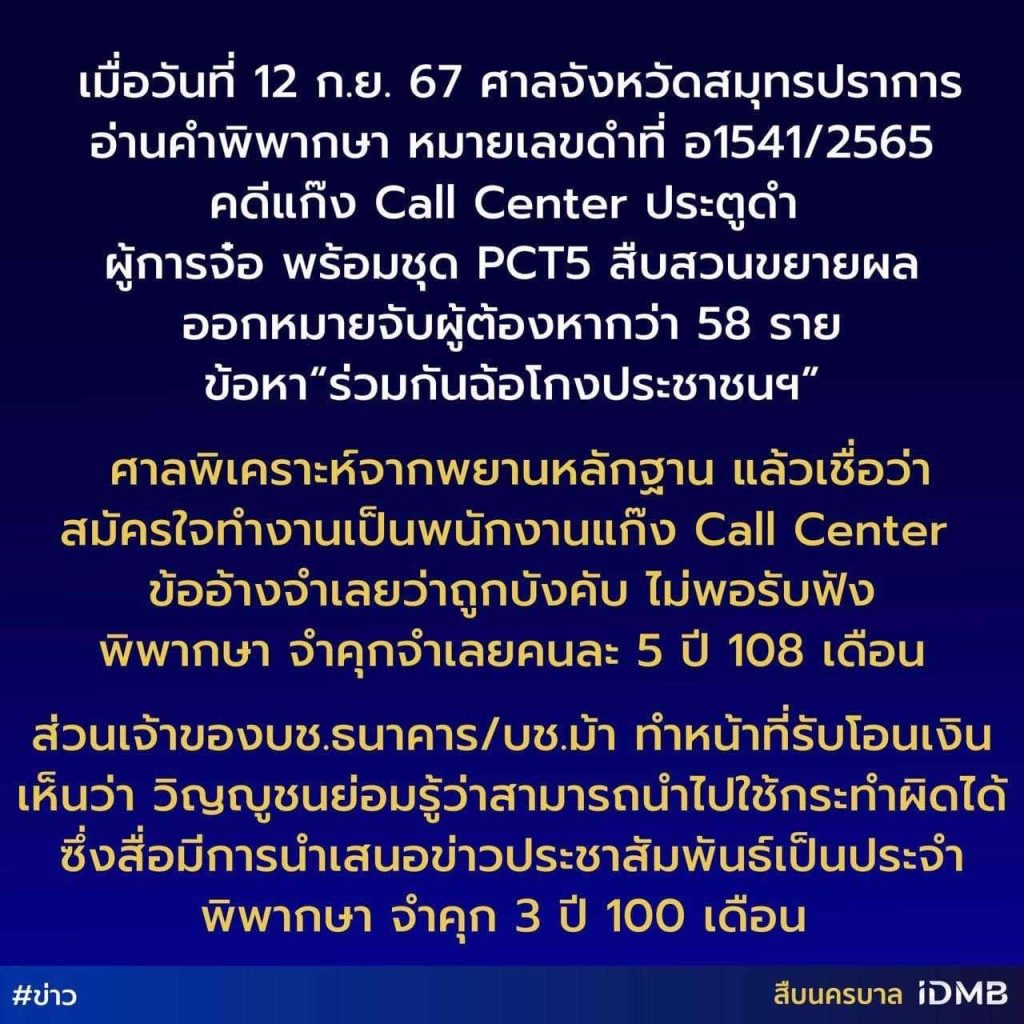 ศาลจังหวัดสมุทรปราการอ่านคำพิพากษา หมายเลขดำที่ อ1541/2565 คดีแก๊ง Call Center ประตูดำ