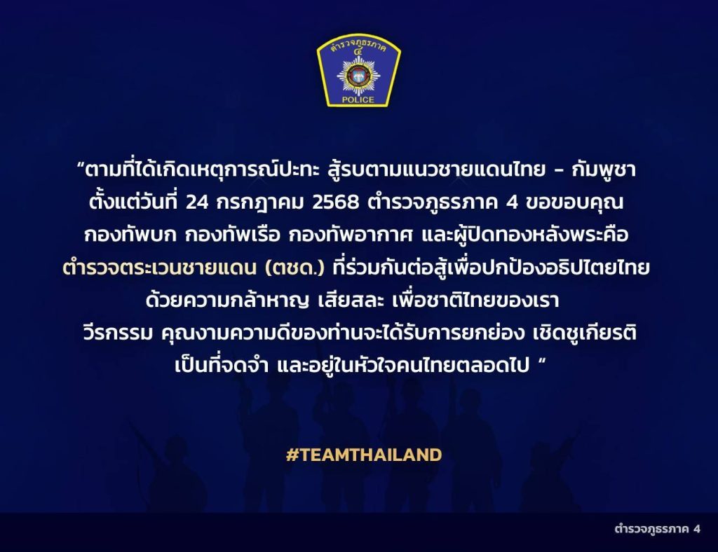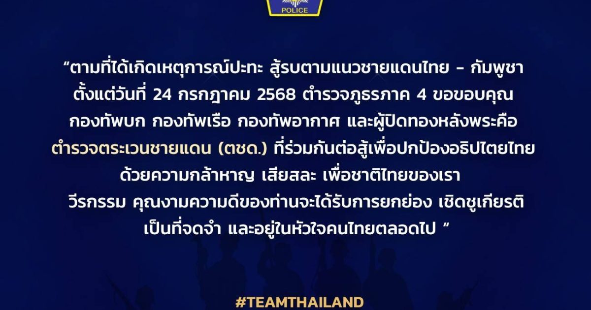พวกเราตำรวจภูธรภาค4 🫡 ขอขอบคุณและส่งกำลังใจให้ #ตำรวจตระเวนชายแดน ผู้รบอยู่แนวหน้า และตำรวจทุกหน่วย ผู้พิทักษ์พื้นที่ส่วนหลังรักษาความปลอดภัยให้พี่น้องประชาชน ผู้ได้รับผลกระทบจากสถานการณ์ ฯ 🇹🇭