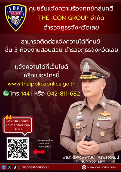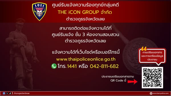 ประชาสัมพันธ์ ศูนย์รับแจ้งความร้องทุกข์THE iCON GROUP เพื่ออำนวยความสะดวกให้แก่ประชาชนผู้เสียหาย และลดความยุ่งยากในการแจ้งความ ตำรวจภูธรจังหวัดเลย สามารถติดต่อแจ้งความได้ที่ศูนย์รับแจ้งความ ชั้น 3 ห้องงานสอบสวนตำรวจภูธรจังหวัดเลย