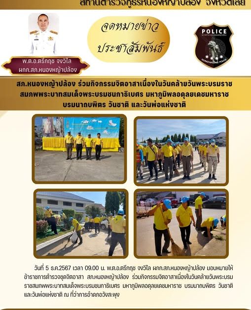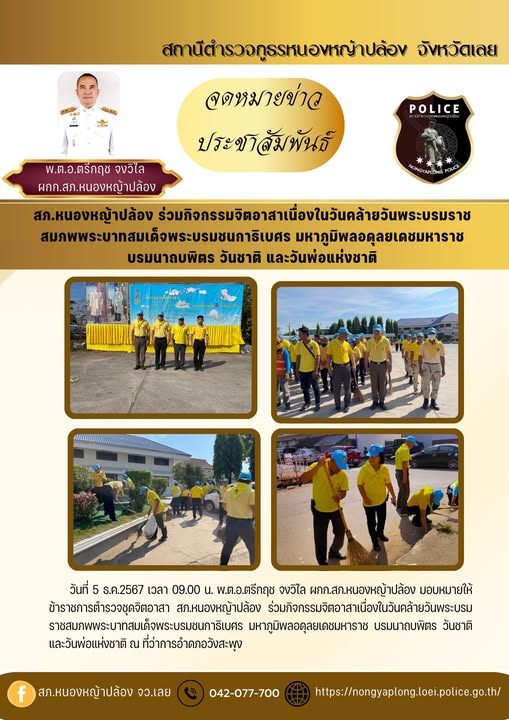 มอบหมายให้ ข้าราชการตำรวจชุดจิตอาสา สภ.หนองหญ้าปล้อง ร่วมกิจกรรมจิตอาสาเนื่องในวันคล้ายวันพระบรมราชสมภพพระบาทสมเด็จพระบรมชนกาธิเบศร มหาภูมิพลอดุลยเดชมหาราช บรมนาถบพิตร วันชาติ และวันพ่อแห่งชาติ