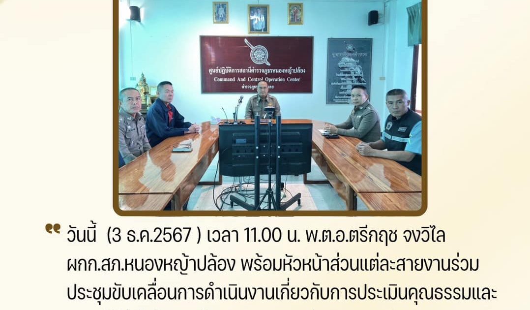 วันที่ 3 ธ.ค. 67 พ.ต.อ.ตรีกฤช จงวิไล ผกก.สภ.หนองหญ้าปล้อง พร้อมหัวหน้าส่วนแต่ละสายงานร่วมประชุมขับเคลื่อนการดำเนินงานเกี่ยวกับการประเมินคุณธรรมและความโปร่งใสในการดำเนินงานของหน่วยงานภาครัฐ ประจำปี 2568