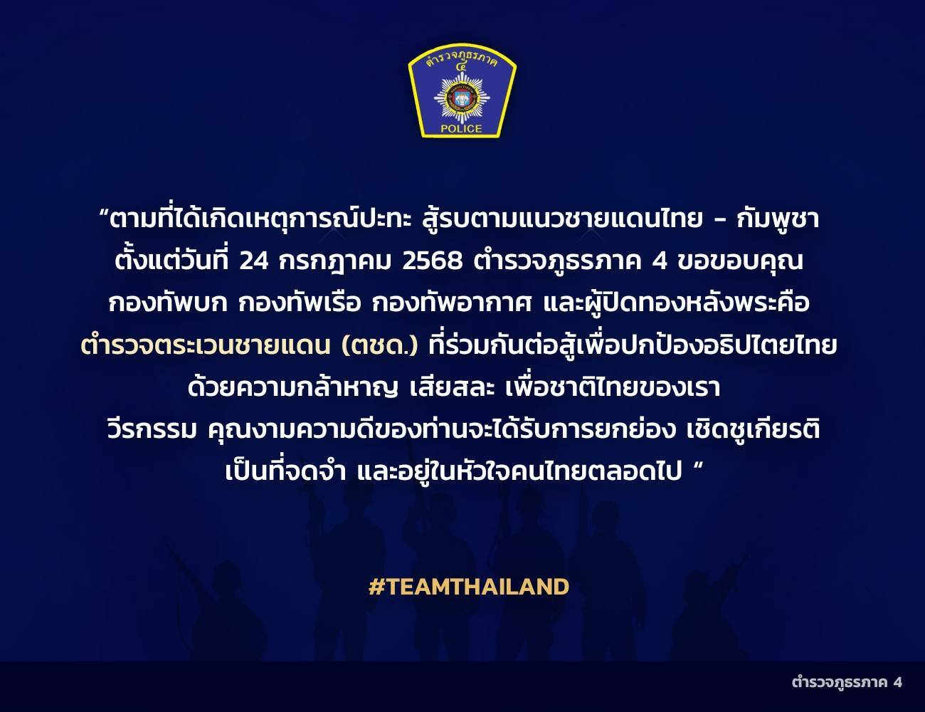 “ตำรวจภูธรภาค4 ขอสดุดีวีรบุรุษทหารกล้า ทั้ง 11 นาย ผู้สละชีพเพื่อปกป้องผืนแผ่นดินไทย🫡” ไทยนี่รักสงบแ